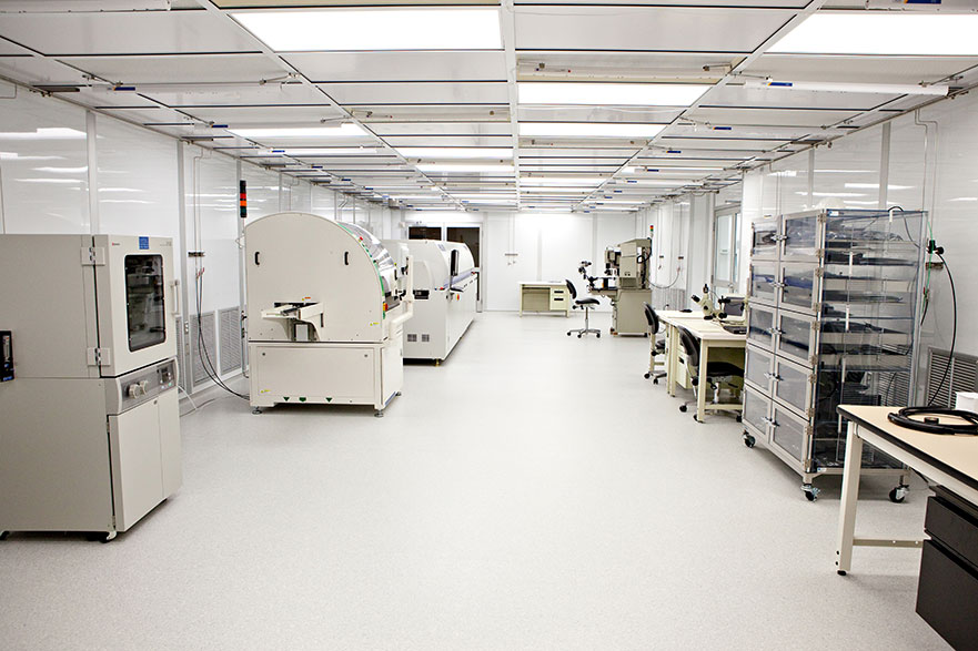 An Class 1000/ISO Class 6 cleanroom provides the optimum environment for for prototype and low volume microelectronics manufacturing and assembly production. Assembly materials such as printed circuit boards (PCBs), components, and wire are stored in dry nitrogen cabinets to reduce contamination and degradation. A sophisticated dispenser/placement machine is used for low volume dispense accuracy and repeatability in addition to ±10μm component placement. Component pick options include waffle pack and wafer for high-precision SMT and bare die, including flip chip assembly. Wire bond interconnect is accomplished with a fully automatic ultrasonic wedge bonder utilizing aluminum wire over a wide diameter range for low and high current applications. A two-channel mass flow controller plasma system is employed to prepare surfaces for die attach, wire bonding, and encapsulation. Material qualification and process control are accomplished via a bond tester coupled with high magnification visual inspection.