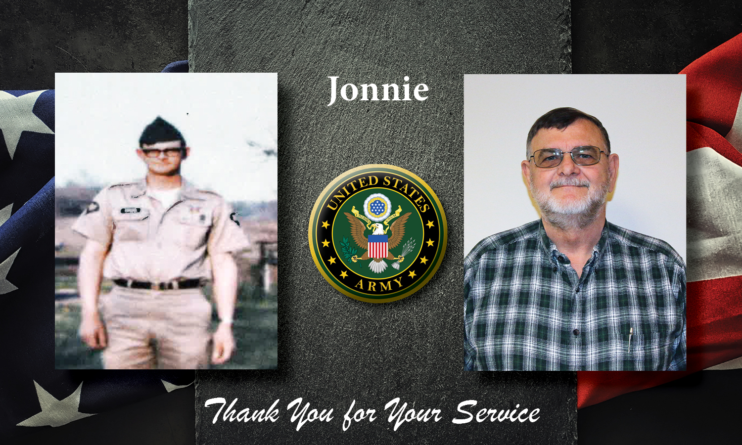 Jonnie served in the Army Ready Reserves from late 1972 through 1976. He was Honorably Discharged with the rank of Sp5 (E5).