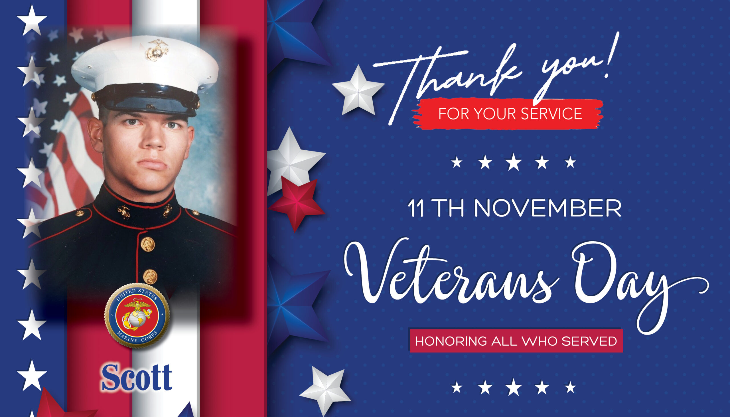 Scott completed US Marine Corps Recruit Depot Parris Island in Port Royal, SC. He graduated on November 12, 1993 two days after the USMC Birthday.