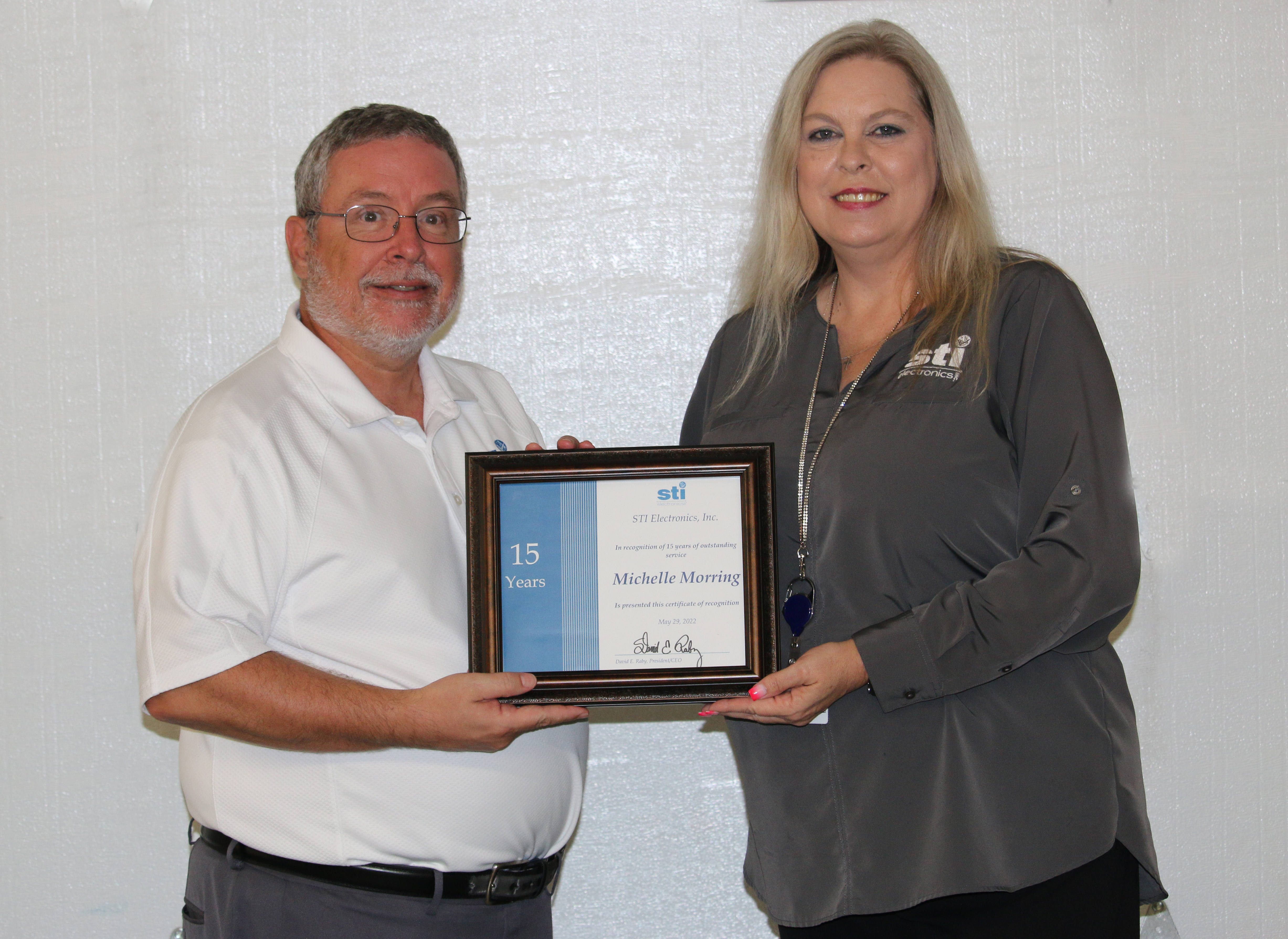 MADISON, AL — June 2022 — STI Electronics, Inc., a full-service organization including engineering, contract manufacturing and training services, announces Michelle Morring’s 15-year anniversary. Morring’s anniversary was celebrated with a cake shared with all of her colleagues at STI. David Raby, President/CEO, presented her with a certificate in appreciation of his 15 years of dedicated service.