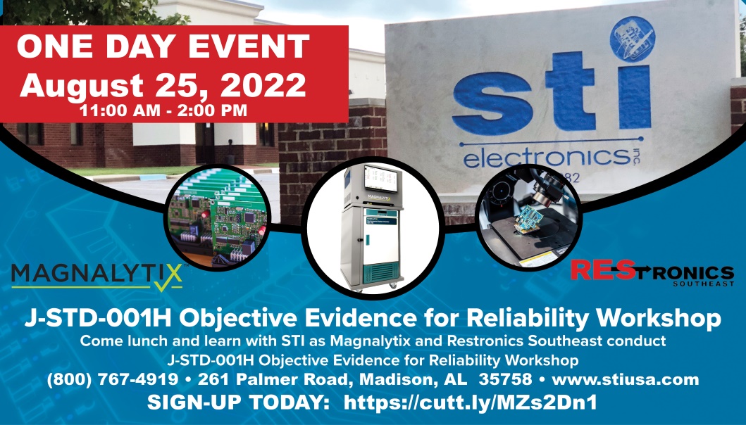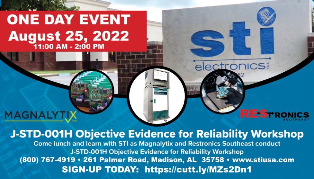 MADISON, AL — July 2022 — STI Electronics, Inc., a full-service organization including engineering, contract manufacturing and training services, announces it will be sponsoring “J-STD-001H Objective Evidence for Reliability Workshop“ on August 25th. Magnalytix and Restronics Southeast will be conducting the workshop. Save the date for the one-day event that will include a panel of interesting discussions concerning Objective Evidence, including a presentation and hands-on demo of the OE-300 SIR Testing System and other Magnalytix Services.
