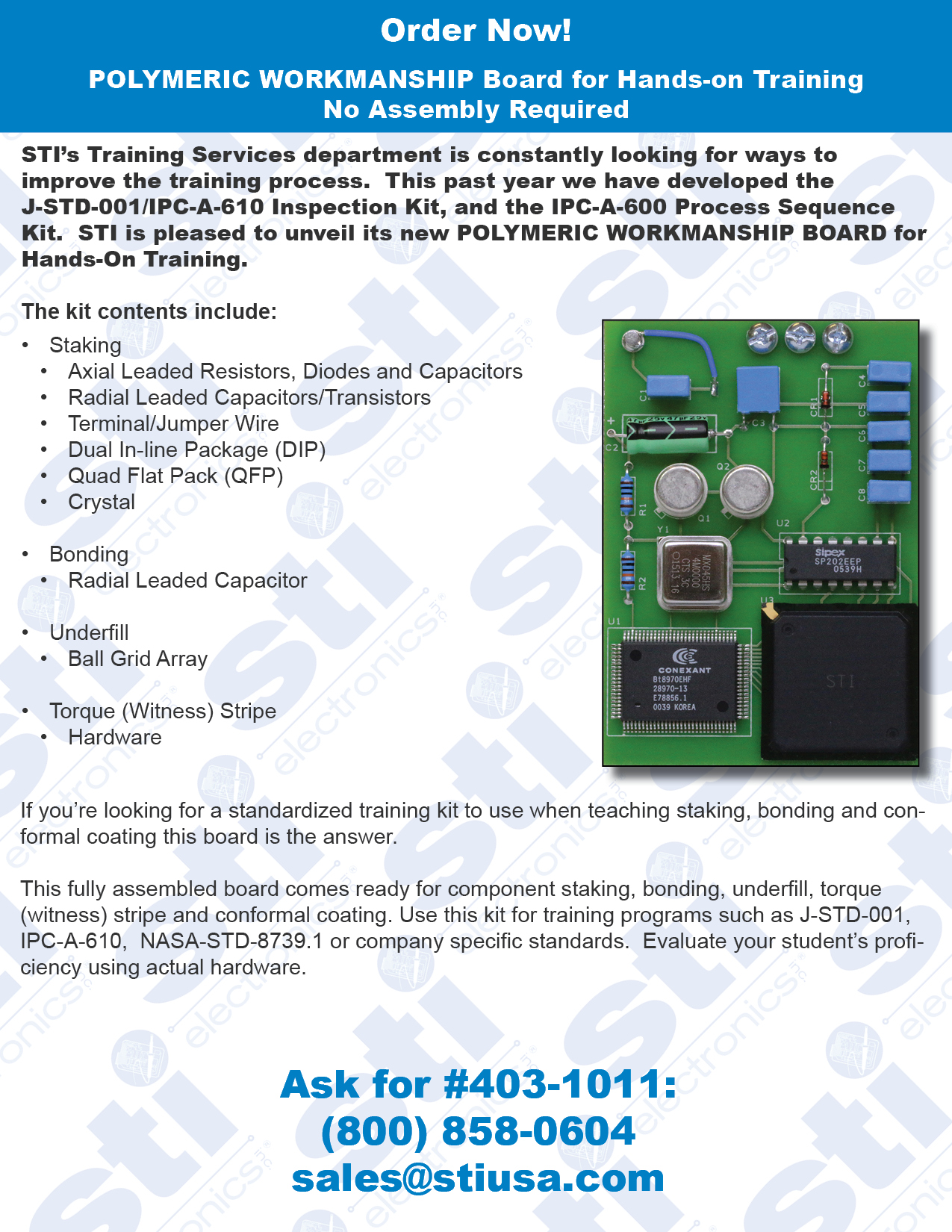 Polymeric Workmanship Board A Fully Assembled Board Staking and Conformal Coating Board for Hands-On Training Each Board Contains: Axial leaded resistors, diodes, capacitors, radial leaded capacitors/transistors, terminal/jumper wire, dual in-line package (DIP), quad flat pack(QFP) and crystal for staking. Radial leaded capacitor for bonding. Ball Grid Array for underfill. Hardward for torque (witness) stripe