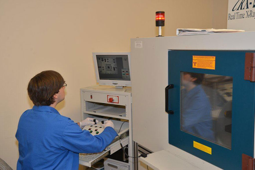 Real time transmission x-ray analysis allows for immediate non-destructive imaging of specimens. The extra large chamber permits specimens ranging from small micro ball grid arrays (BGA) to large circuit board assemblies (18” x 21”). Interior defect characterization is possible using the digitally projected x-ray image. As with the Scanning Electron Microscope (SEM), high-resolution images can be digitally captured or photo quality images can be printed depending on the requirements of the analysis. X-Ray inspection can be utilized for examination of the following examples: